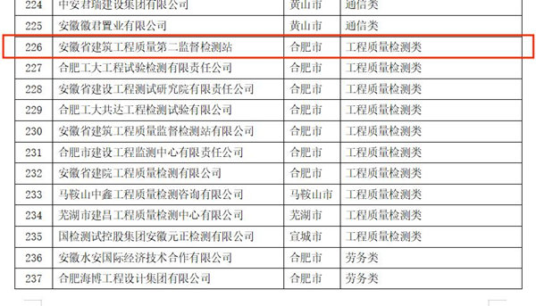 近日,省住房和城鄉建設廳公布“2021年度安徽省優(yōu)秀建筑業(yè)企業(yè)”名單,安徽省質(zhì)檢二站喜獲建筑工程-工程質(zhì)量檢測類(lèi)“2021年度安徽省優(yōu)秀建筑業(yè)企業(yè)”稱(chēng)號。