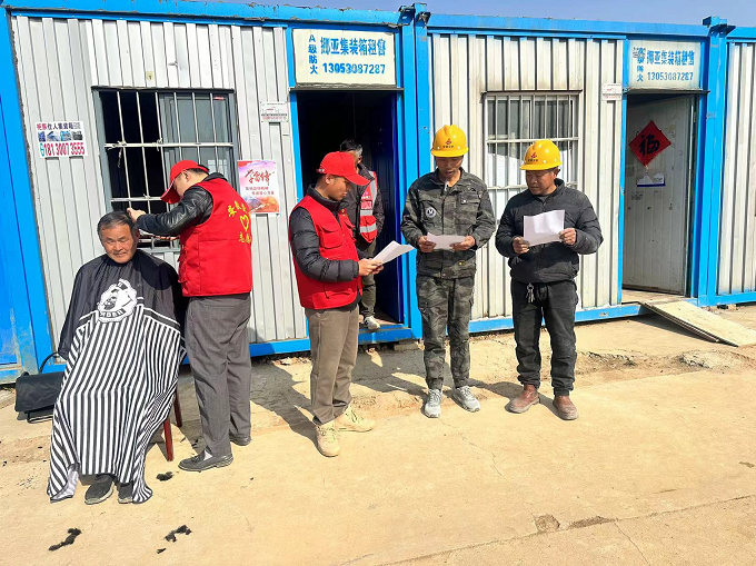 潭沖河家園項目發(fā)動(dòng)青年志愿者們?yōu)轫椖抗と税l(fā)放文明宣傳手冊,講解宣傳合肥市民公約(守則),同時(shí)團支部組織志愿者服務(wù)活動(dòng),為工人提供義務(wù)理發(fā)。