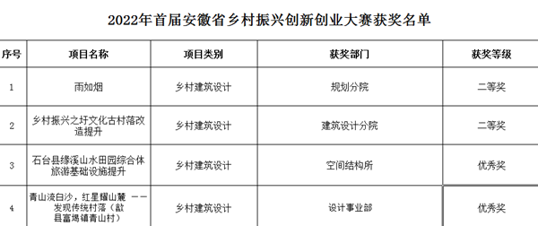 近日,2022年首屆安徽省鄉村振興創(chuàng )新創(chuàng )業(yè)大賽公布獲獎名單。經(jīng)過(guò)激烈角逐,安徽省建科院提交的項目“雨如煙”和“鄉村振興之圩文化古村落改造提升”獲得二等獎,“石臺縣緣溪山水田園綜合體旅游基礎設施提升”和“青山流白沙,紅星耀山麓 ——發(fā)現傳統村落(歙縣富堨鎮青山村)”獲得優(yōu)秀獎。
