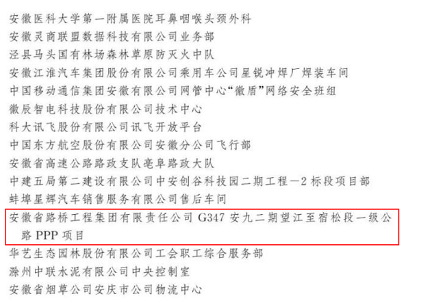4月27日,2023年慶?!拔逡弧眹H勞動(dòng)節暨全國五一勞動(dòng)獎和全國工人先鋒號表彰大會(huì )在北京人民大會(huì )堂舉行。207個(gè)集體和1035名個(gè)人分獲全國五一勞動(dòng)獎狀、獎?wù)拢?044個(gè)集體獲全國工人先鋒號。由安徽建工建設投資集團承建的G347安九二期PPP項目被中華全國總工會(huì )授予“全國工人先鋒號”榮譽(yù)稱(chēng)號。