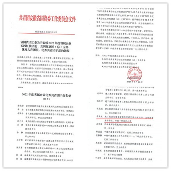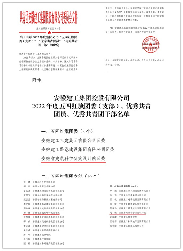其中,設計二支部團委宣傳委員范卓越同志榮獲“省屬企業(yè)優(yōu)秀共青團干部”稱(chēng)號,安徽省建科院團委榮獲“集團五四紅旗團委”稱(chēng)號,檢測二支部團委組織委員劉俊同志榮獲“集團優(yōu)秀共青團干部”稱(chēng)號,綜合支部龔一博同志榮獲“集團優(yōu)秀共青團員”稱(chēng)號!