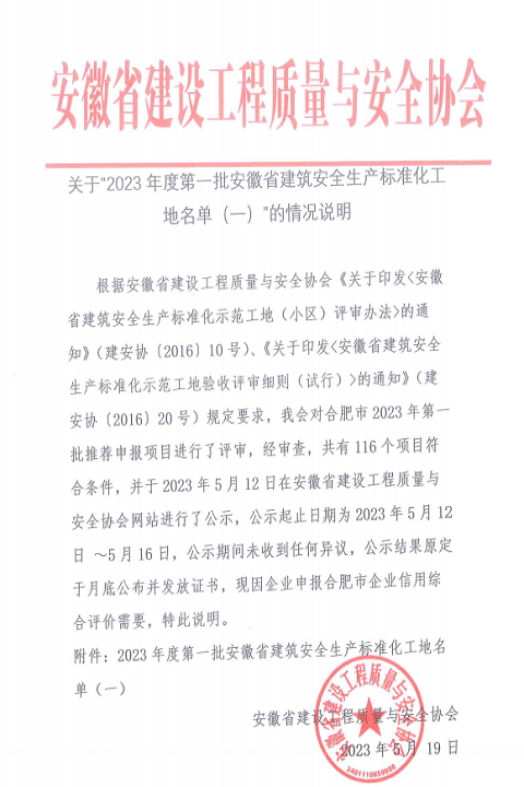 近日,安徽省建設工程質(zhì)量與安全協(xié)會(huì )關(guān)于2023年第一批安徽省建筑安全生產(chǎn)標準化工地名單公示,建工一建三分公司丁香苑項目獲得“安徽省建筑安全生產(chǎn)標準化工地”榮譽(yù)稱(chēng)號。