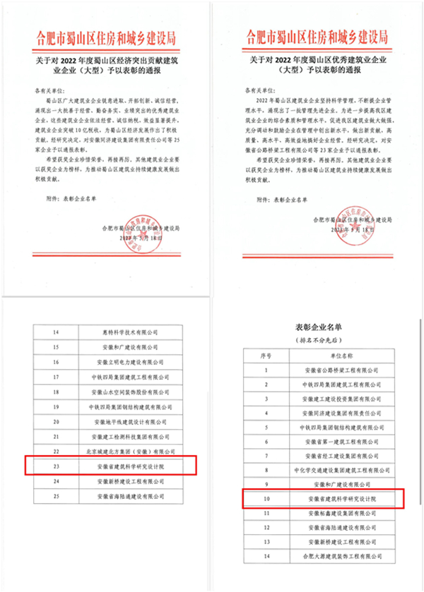 5月18日,合肥市蜀山區住房和城鄉建設局公布了“優(yōu)秀建筑業(yè)企業(yè)”和“經(jīng)濟突出貢獻建筑業(yè)企業(yè)”名單,安徽省建筑科學(xué)研究設計院榮列榜中。