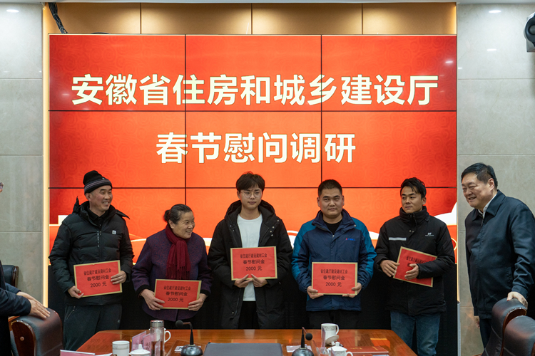 在新春佳節即將到來(lái)之際,1月28日下午,省住建廳黨組書(shū)記、廳長(cháng)賀懋燮一行來(lái)到安徽建工集團所屬安徽三建公司走訪(fǎng)慰問(wèn)困難職工并召開(kāi)座談會(huì ),送來(lái)廳黨組的關(guān)心關(guān)懷。廳黨組成員、副廳長(cháng)吳桂和,廳黨組成員、副廳長(cháng)陳揚年,廳黨組成員、總工方廷勇,建工控股黨委副書(shū)記、總經(jīng)理劉家靜,黨委委員、紀委書(shū)記、監察專(zhuān)員王汪苗陪同慰問(wèn)。