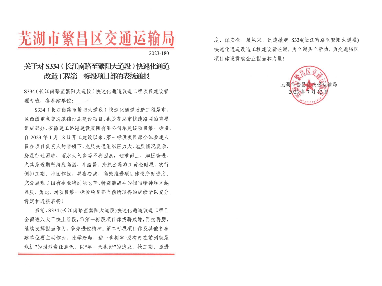 7月13日,蕪湖市繁昌區交通運輸局發(fā)來(lái)表?yè)P信,對建工路港S334快速化通道改造工程第一標段項目部當前所取得的成績(jì)予以充分肯定和通報表?yè)P。