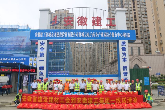 7月20日上午,安徽省建設建材工會(huì )(省住建廳文明辦)主任、一級調研員程德旺到安徽建工舒城縣電子商務(wù)產(chǎn)業(yè)園綜合服務(wù)中心建設項目開(kāi)展“送清涼”慰問(wèn)活動(dòng)。省建設建材工會(huì )(省住建廳文明辦)副主任葉雪清,建工控股工會(huì )副主席、建工股份副總經(jīng)理邢應梅,建工總承包黨委書(shū)記、總經(jīng)理傅宏林,建工控股工會(huì )女工委副主任饒曉寧等參加。