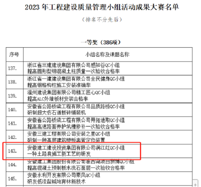 近日,中國建筑業(yè)協(xié)會(huì )公示2023年工程建設質(zhì)量管理小組活動(dòng)成果大賽獲獎名單,建工建投集團第二分公司滿(mǎn)江紅QC小組申報的活動(dòng)成果《一種土路肩施工新工藝的研發(fā)》,經(jīng)安徽省建設工程質(zhì)量與安全協(xié)會(huì )推薦,中國建筑業(yè)協(xié)會(huì )專(zhuān)家組審核評定,在2498項QC活動(dòng)成果中脫穎而出,榮獲2023年工程建設質(zhì)量管理小組活動(dòng)成果大賽一等獎。