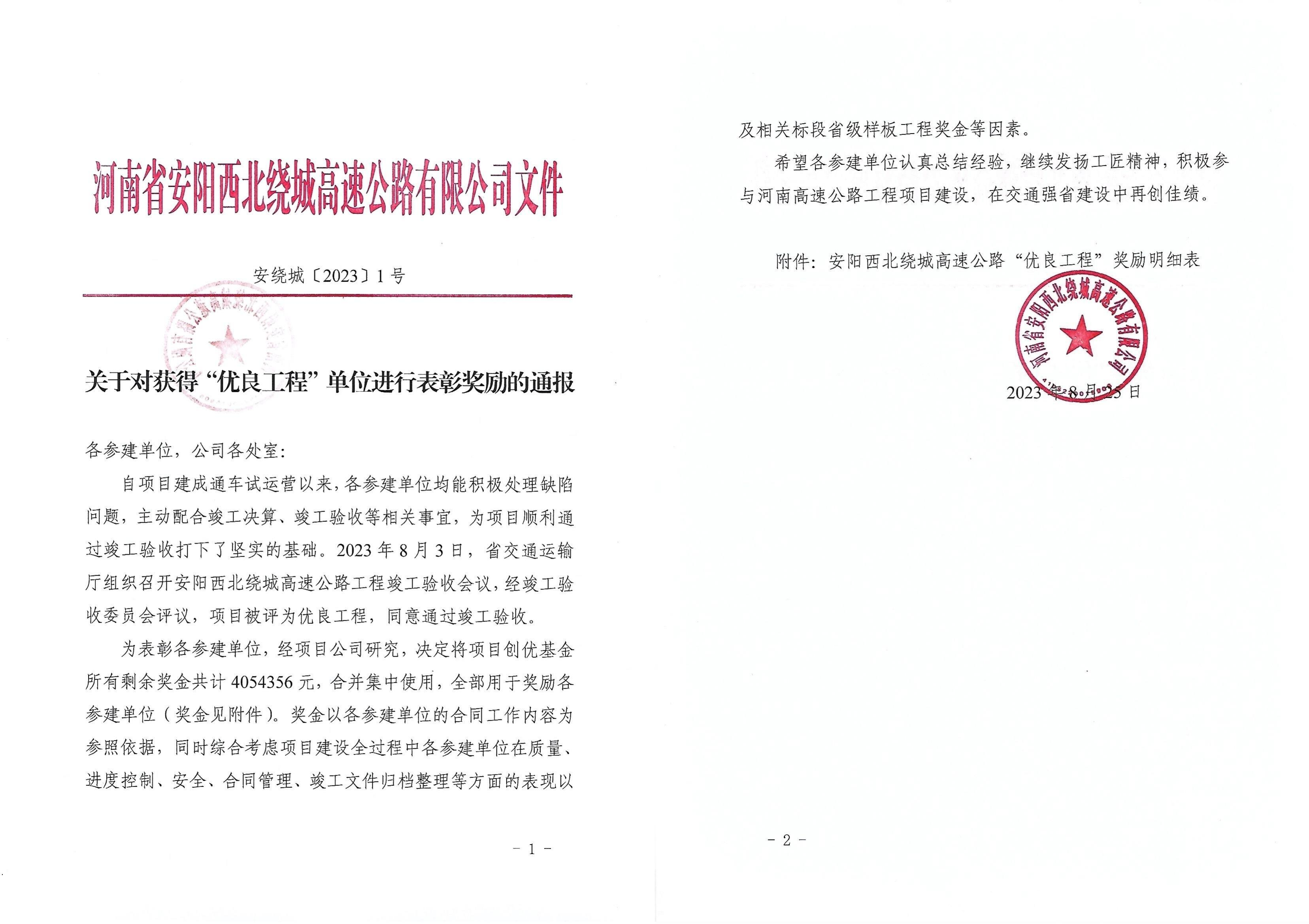 此次表彰獎勵,是對項目全體人員在實(shí)施期間努力的回報和肯定。安陽(yáng)西北繞城高速公路TJ-4標是公司首個(gè)省外高速項目,取得了良好的經(jīng)濟效益和社會(huì )效益,為公司打造了品牌,為進(jìn)一步打開(kāi)省外市場(chǎng)作出了應有的貢獻。