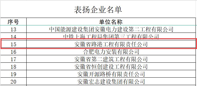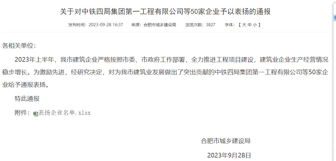 近日,合肥市城鄉建設局發(fā)布《關(guān)于對中鐵四局集團第一工程有限公司等50家企業(yè)予以表?yè)P的通報》,建工路港榮獲合肥市城鄉建設局通報表彰!