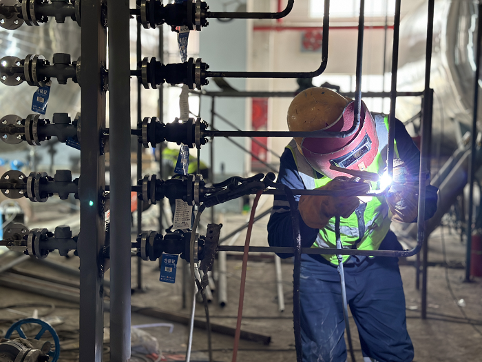 項目部團結一心創(chuàng )新施工方法,巧妙利用安裝工藝。T-1201塔附件安裝后重量達100噸,高48米,上半部寬6.3米,需起吊至20米高屋面后放置在車(chē)間室內基礎上,吊裝高度較大,極易發(fā)生整體失穩,是該項目施工過(guò)程中的一個(gè)重點(diǎn)、難點(diǎn)。項目部提前謀劃,合理安排T-1201塔及附件的安裝順序,塔器進(jìn)場(chǎng)后選好現場(chǎng)加工場(chǎng)地,將塔水平吊至臨時(shí)支撐架上,進(jìn)行附件管道及檢修廊道制作安裝,使結構在安裝時(shí)盡早形成空間穩定體系,然后以穩定體系為基準擴展安裝,保證安裝過(guò)程中整體結構始終為穩定體系,最終順利完成吊裝任務(wù)。同時(shí),項目部為在施工方式上擴大優(yōu)勢提高效率動(dòng)腦筋、想辦法,創(chuàng )新推動(dòng)新技術(shù)運用,最終結合實(shí)際在部分車(chē)間領(lǐng)先使用了半管及夾套管工藝,有效減少管道系統的噪聲,大大減少管道系統的能耗,達到節約能源和節約材料的目的,對項目降本增效起到良好的助推作用。目前該先進(jìn)技術(shù)在安徽地區鮮有使用,值得推廣借鑒。