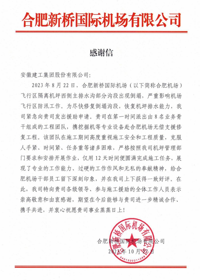 近日,合肥機場(chǎng)向安徽建工集團發(fā)來(lái)感謝信,信中對安徽建工集團合肥新橋國際機場(chǎng)T2航站樓工程項目部在支援修復合肥機場(chǎng)排水溝倒塌溝段、恢復機坪排水能力工程作業(yè)中展現的專(zhuān)業(yè)的工作能力、過(guò)硬的工作作風(fēng)、無(wú)私的奉獻精神予以高度肯定和贊揚。
