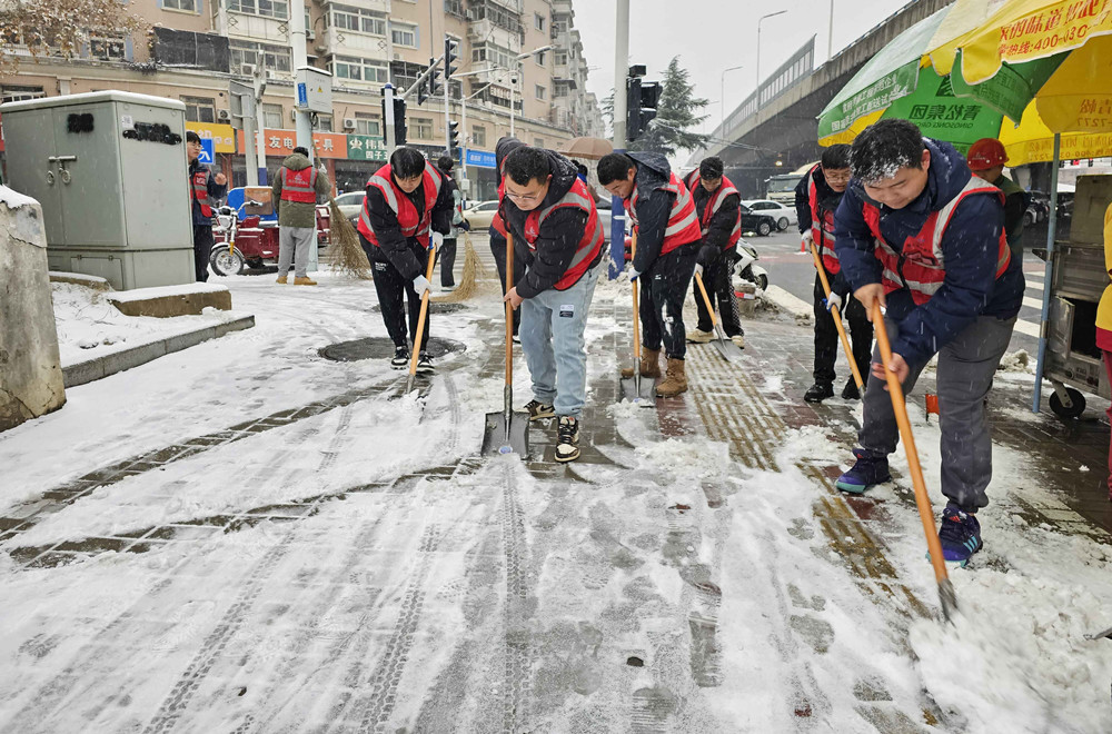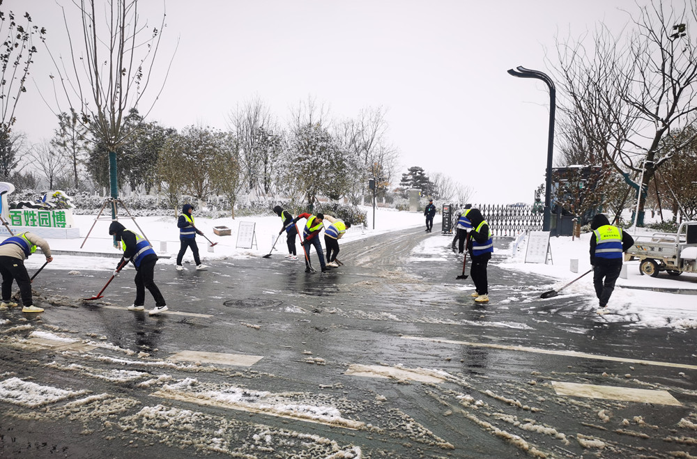 ▲青海路項目由項目經(jīng)理帶隊,發(fā)動(dòng)項目班子及普通員工共17人,使用鐵鍬、掃把、融雪鹽,為青海路撒鹽鏟雪,有效保障了行車(chē)安全,為園博園入園觀(guān)賞的游客提供安全保障。