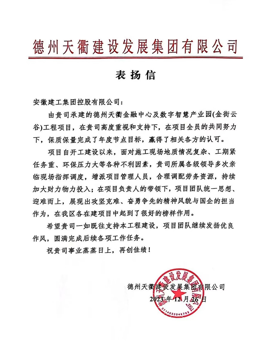 12月26日,德州天衢建設發(fā)展集團有限公司發(fā)來(lái)表?yè)P信,對安徽建工天衢金融中心及數字智慧產(chǎn)業(yè)園項目高質(zhì)量完成年前節點(diǎn)目標,為德州天衢新區經(jīng)濟建設做出的貢獻提出表?yè)P。