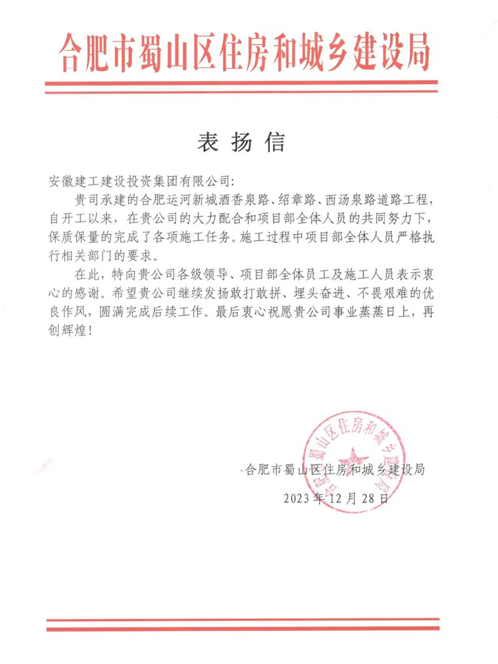 近日,建工建投集團收到合肥市蜀山區住房和城鄉建設局發(fā)來(lái)的表?yè)P信。信中對建工建投各級領(lǐng)導、項目部全體員工及施工人員表示衷心的感謝。