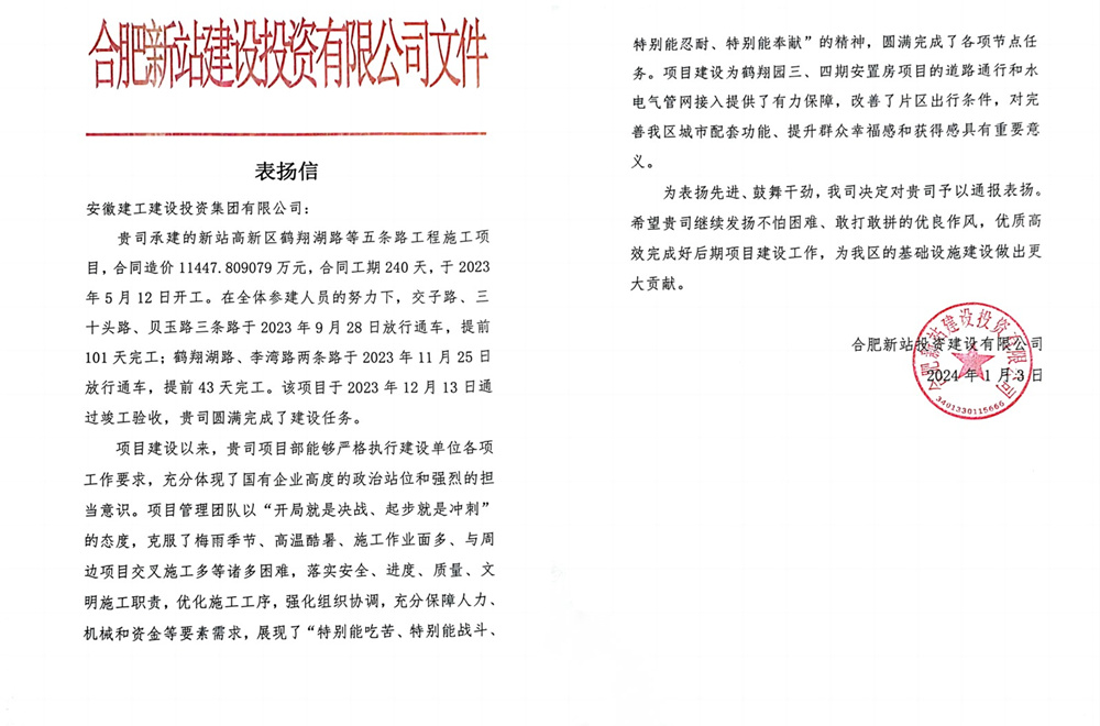 近日,建工建投集團收到合肥新站投資建設有限公司發(fā)來(lái)的表?yè)P信。信中對建工建投集團及鶴翔湖路等五條路工程施工項目管理團隊提前43天圓滿(mǎn)完成施工任務(wù)予以充分肯定和表?yè)P。