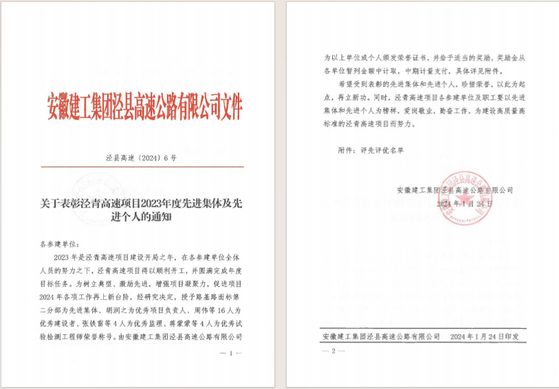 近日,安徽建工集團涇縣高速公路有限公司發(fā)來(lái)《關(guān)于表彰涇青高速項目2023年度先進(jìn)集體及先進(jìn)個(gè)人的通知》,涇青高速路基路面標第三分部項目許木子等四位同志榮獲“2023年優(yōu)秀建設者”稱(chēng)號。
