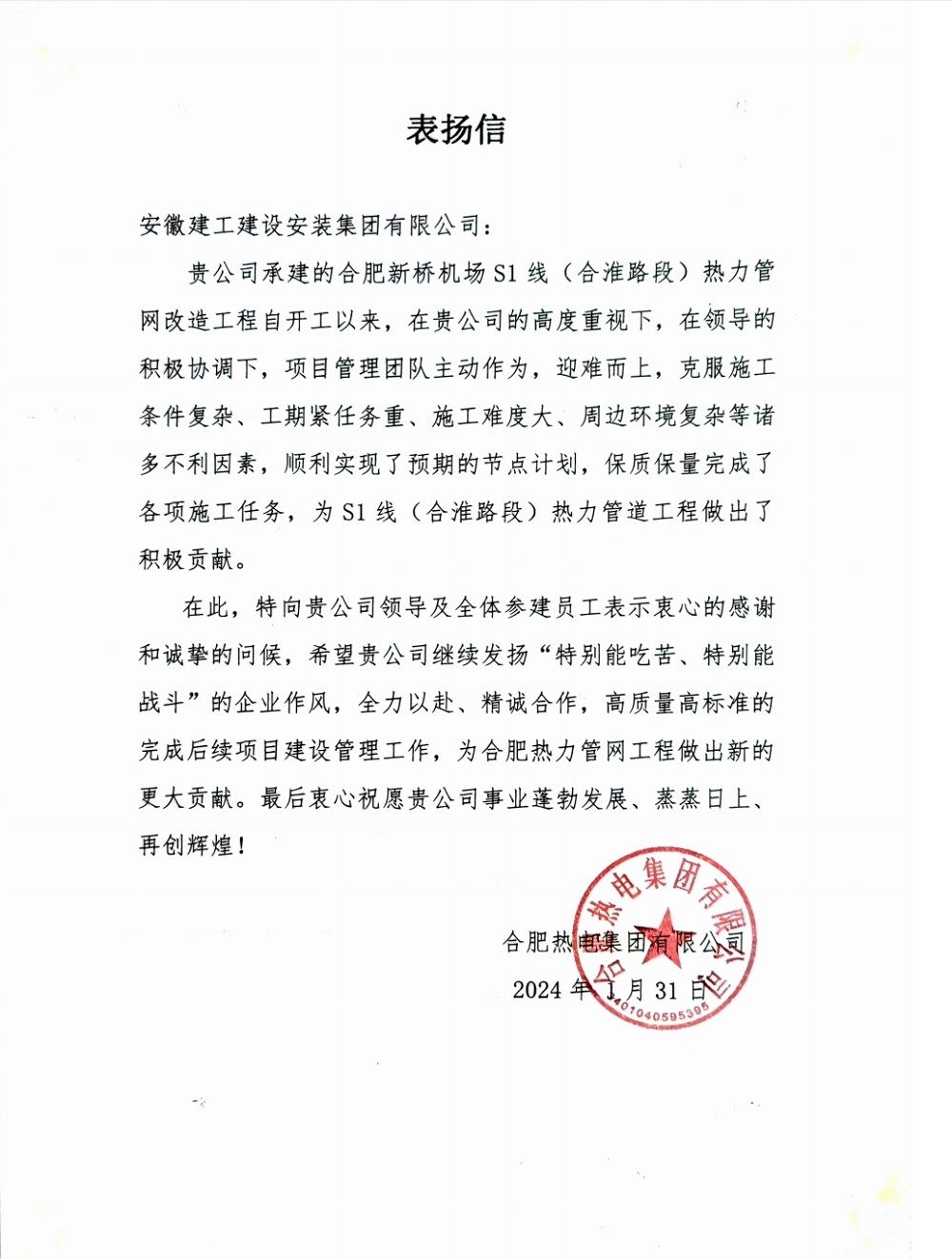 【贏(yíng)口碑·樹(shù)形象】點(diǎn)贊!建工安裝承建的合肥新橋機場(chǎng)S1線(xiàn)(合淮路段)熱力管網(wǎng)改造工程收到業(yè)主表?yè)P信