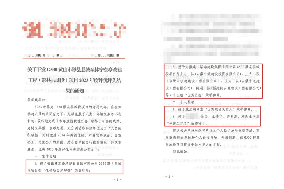 喜訊!建工路港黟縣G530項目榮獲業(yè)主單位2023年“優(yōu)秀項目經(jīng)理部”等榮譽(yù)稱(chēng)號