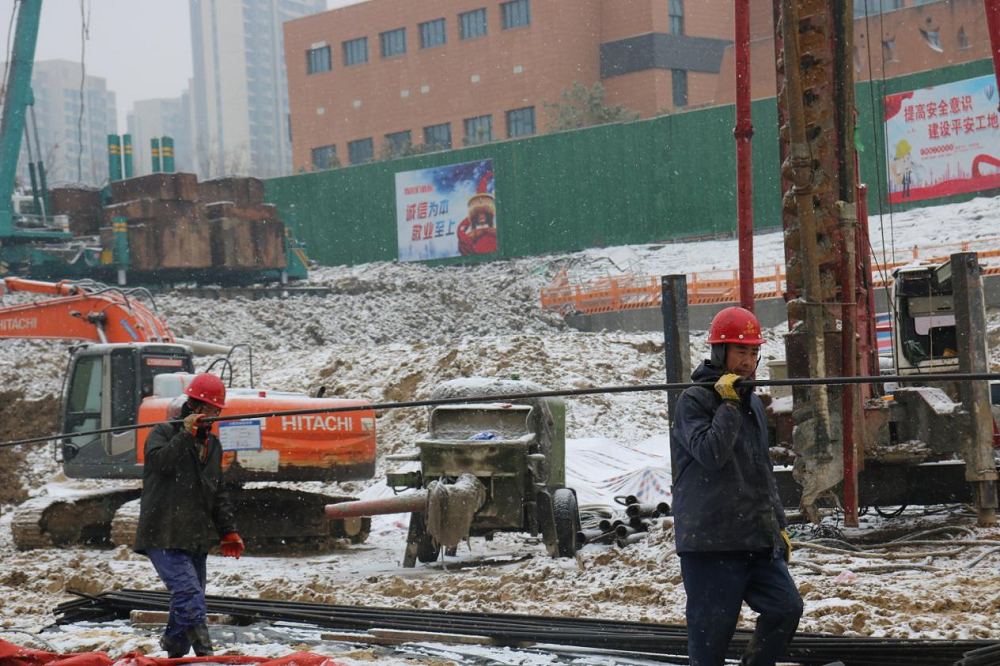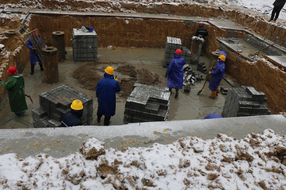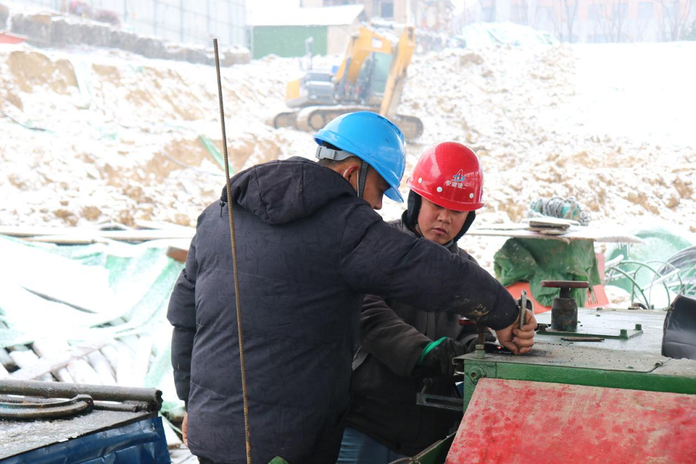 項目部結合實(shí)際開(kāi)展安全施工教育培訓,有效推進(jìn)現場(chǎng)樁芯鋼筋加工制作、礎磚胎膜抹灰、砌筑、道路鋪設磚渣、地庫承臺樁芯澆筑等生產(chǎn)工作,確保降雪降溫不降產(chǎn)。