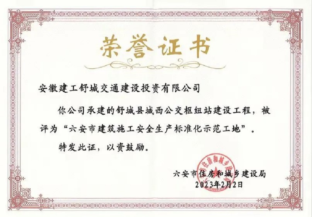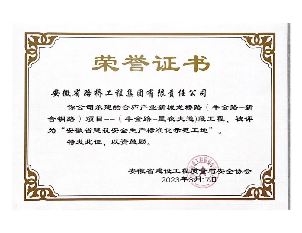合廬項目獲得省安全文明示范工地,S244項目獲得省級平安工程,舒城城西項目獲得六安市建筑施工安全生產(chǎn)標準化示范工地及集團公司安全文明標準化工地,合周項目榮獲安徽省AAA及環(huán)保施工示范工地。
