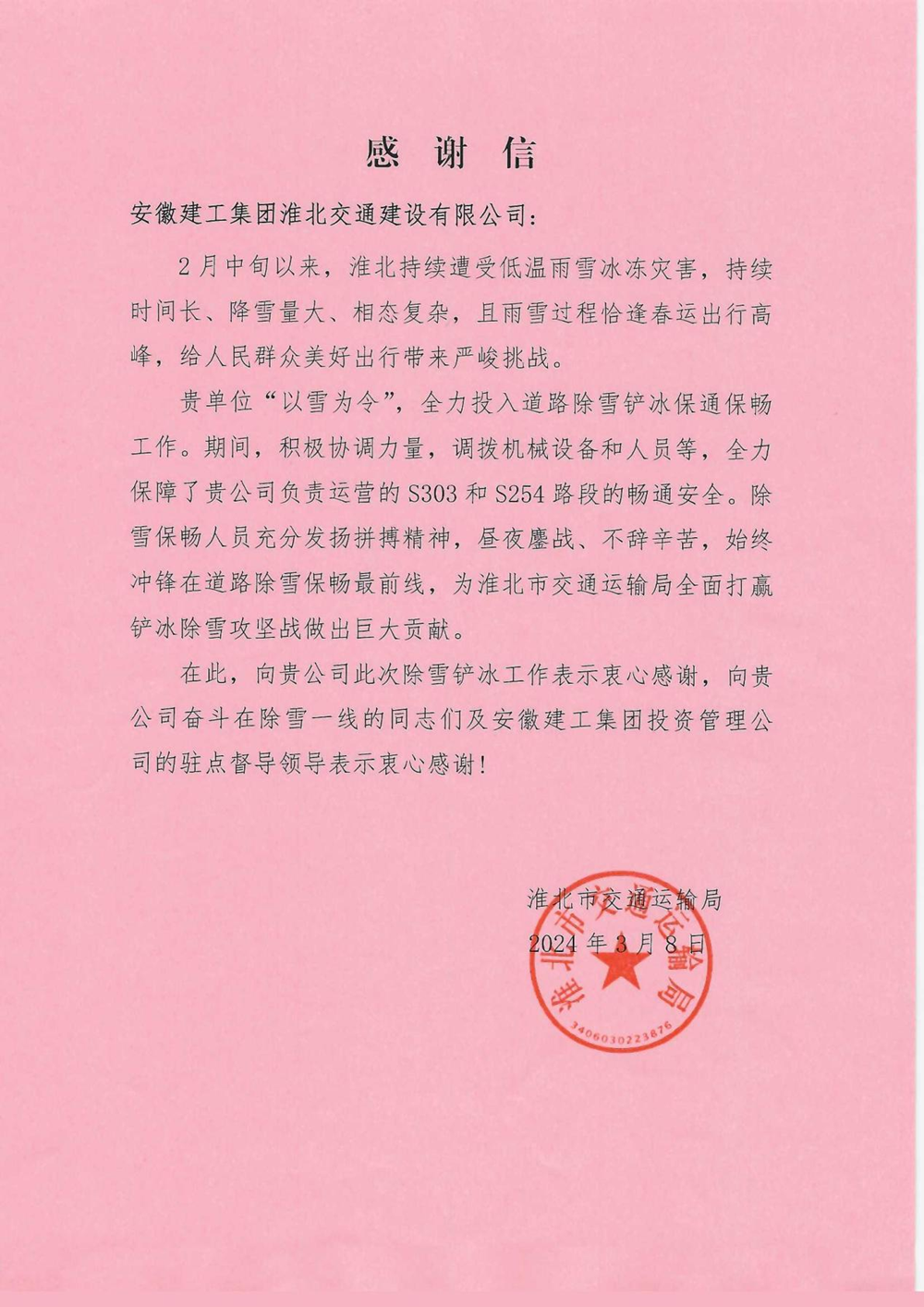 近期,建工投資所轄安徽建工集團淮北交通建設有限公司收到淮北市交通運輸局表?yè)P信,高度贊揚了項目公司在除雪保暢工作中的突出貢獻。