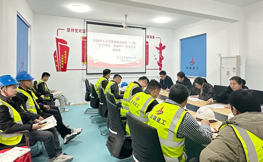 為深入學(xué)習貫徹集團三屆一次職代會(huì )暨2024年工作會(huì )議和公司十七屆四次職代會(huì )精神,全面落實(shí)“項目管理強化年”工作部署和集團2024年度“當好主人翁 建功大發(fā)展”勞動(dòng)競賽活動(dòng)相關(guān)要求,3月13日下午,建工安裝安徽理工大學(xué)維修改造(二期)項目在項目部現場(chǎng)召開(kāi)了“大干20天、決戰3.31”勞動(dòng)競賽動(dòng)員會(huì )。滁州分公司黨支部書(shū)記、副經(jīng)理程茂麗、副經(jīng)理張漢軍等勞動(dòng)競賽領(lǐng)導小組成員出席會(huì )議,項目部全體管理人員及施工班組代表參會(huì )。