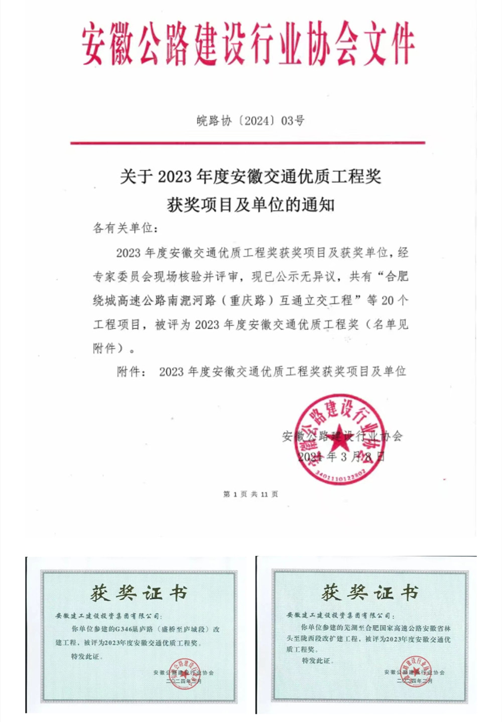 喜報!建工建投集團兩項目榮獲2023年度安徽交通優(yōu)質(zhì)工程獎