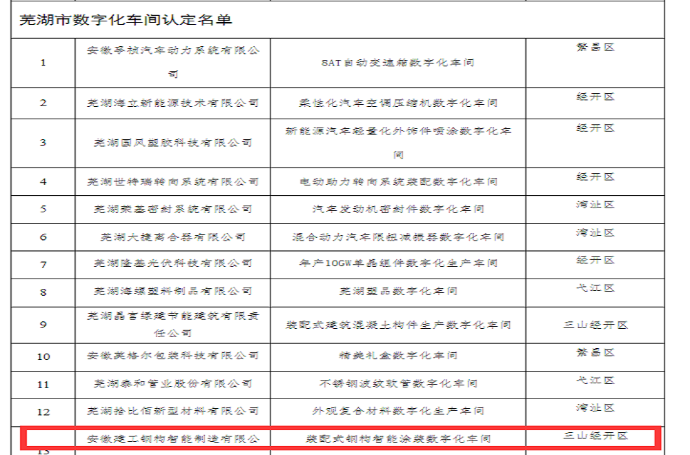 喜報!建工鋼構蕪湖公司被認定為2024年蕪湖市數字化車(chē)間