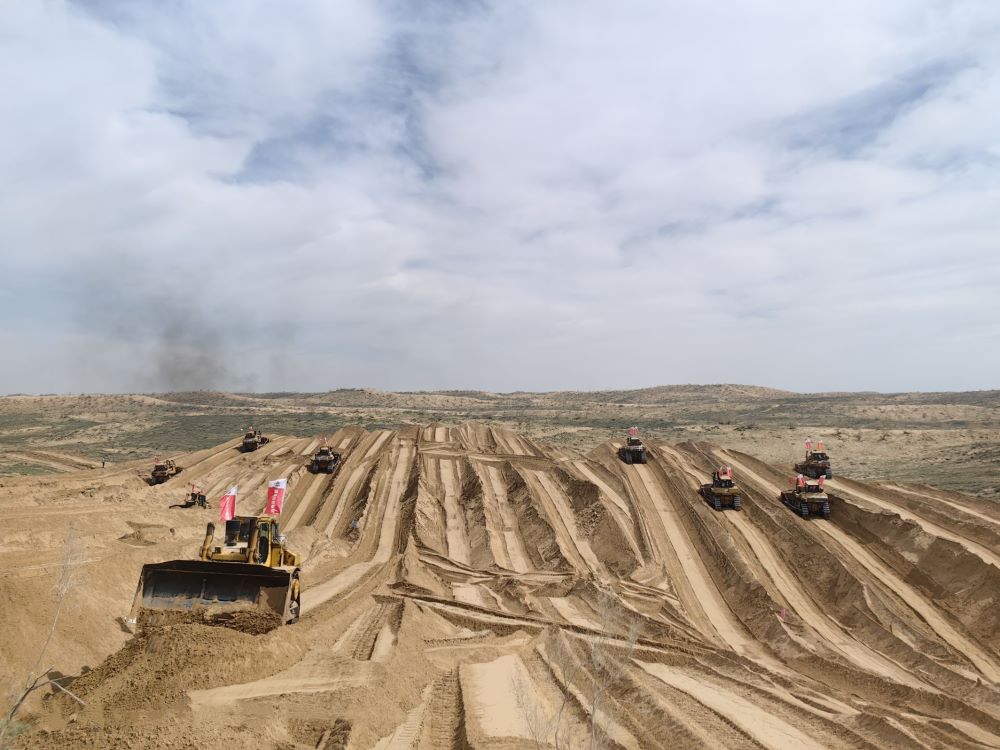 由于項目位于沙漠深處,經(jīng)常面臨無(wú)水、無(wú)電、無(wú)信號等惡劣環(huán)境,項目建設團隊不畏困難,在經(jīng)歷2次沙塵暴襲擾后,仍嚴格按照工作進(jìn)度計劃,順排工序,倒排工期,加快推進(jìn)項目建設,每天指揮28臺推土機、2臺鏟車(chē)、5臺挖機全負荷運轉,不斷向古爾班通古特沙漠挺進(jìn),力爭在7月底完成全線(xiàn)路基施工。