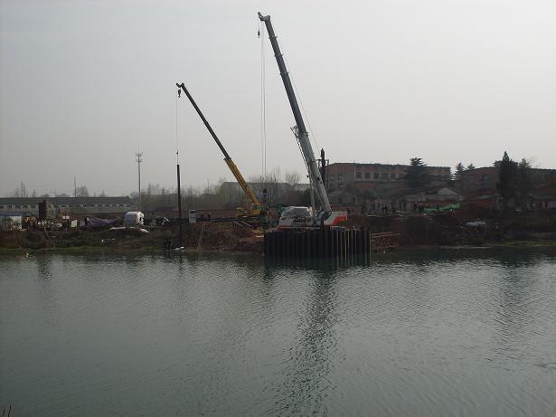 淠望路大橋作為市政工程具有工期緊、任務(wù)重、技術(shù)難度大的特點(diǎn),但經(jīng)項目部領(lǐng)導精心組織、科學(xué)部署,加大人力與設備的投入,自2月1日進(jìn)場(chǎng)開(kāi)工以來(lái),全部90根挖孔樁已開(kāi)挖41根,累計深度270m;于2月18日開(kāi)始進(jìn)行關(guān)鍵工序——主墩右幅鋼板樁圍堰施工。由于淠史杭干渠承擔皖豫兩省14個(gè)縣(區)的春耕灌溉任務(wù),六安市重點(diǎn)辦要求加快施工進(jìn)度,必須在4月15日完成所有水下工程及用于水面以上施工的支撐等,并于4月25日前完成圍堰拆除清理工作。項目部立即召開(kāi)緊急動(dòng)員會(huì ),號召全體技術(shù)人員克服一切困難和挑戰,堅決完成上級交代的任務(wù),并立即組織技術(shù)人員根據鋼板樁長(cháng)度、水深、地質(zhì)、承臺埋置深度等情況,制定了科學(xué)的施工技術(shù)方案、成立了以項目部經(jīng)理、副經(jīng)理為組長(cháng)的安全領(lǐng)導小組。施工所用的T90振動(dòng)錘、70t吊車(chē)、25t吊車(chē)、PC200挖機、 T100推土機、ZLM50裝載機、自卸車(chē)等重型機械設備陸續開(kāi)進(jìn)施工現場(chǎng)。