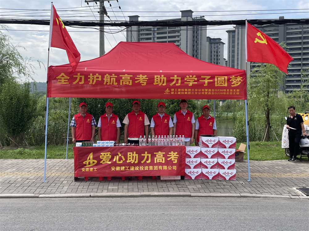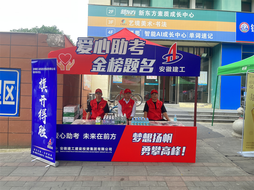 望江安建交通建設管理有限公司、望江安建安九公路建設有限公司在望江縣第三中學(xué)志愿點(diǎn)熱情地忙碌著(zhù),他們?yōu)榭忌鷾蕚淞说V泉水,在考點(diǎn)門(mén)口維持秩序、引導考生入場(chǎng),助力學(xué)子們安心應考。