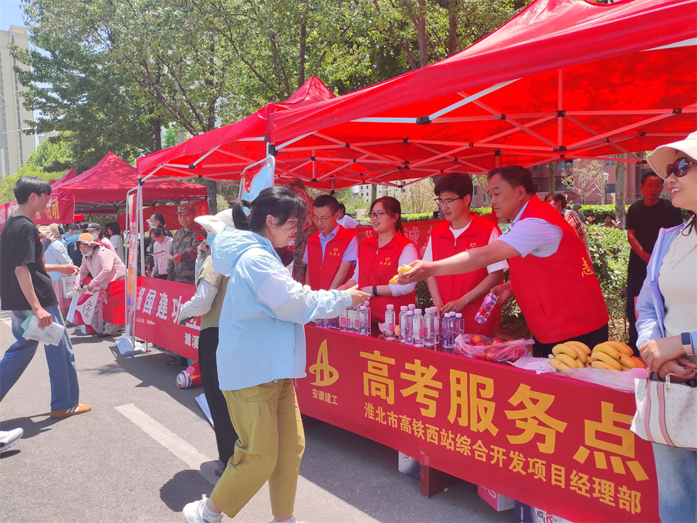 淮北市高鐵西站綜合開(kāi)發(fā)項目在濉溪縣第二中學(xué)外搭建起溫馨的服務(wù)站,為考生和家長(cháng)提供各類(lèi)貼心服務(wù),如礦泉水、防暑物品、水果等。他們以真誠的笑容和細致的關(guān)懷,為緊張的高考氛圍增添了溫暖與力量。
