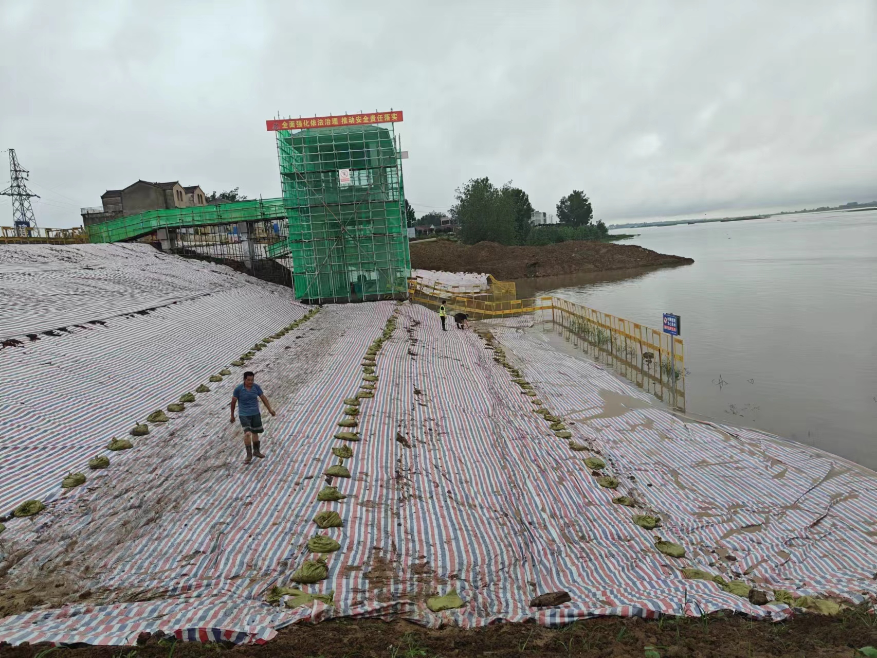 為切實(shí)做好降雨防范應對工作,項目聞“汛”動(dòng),按照防汛演練方案,逐步開(kāi)展防汛保障工作。7月初,項目安排專(zhuān)人實(shí)行防汛值班和巡檢制度,每日匯報降雨和堤壩情況。7月12日,降雨量持續增加,曾臺排灌站周邊堤壩隨時(shí)都有發(fā)生滑坡的情況。經(jīng)過(guò)項目部科學(xué)研判,立即組織人員鋪設花雨布,利用提前準備的防汛物資,將碎石裝進(jìn)編織袋,運至堤壩坡面,有效防止水流侵蝕,保護堤壩的穩定性,防止險情發(fā)生。