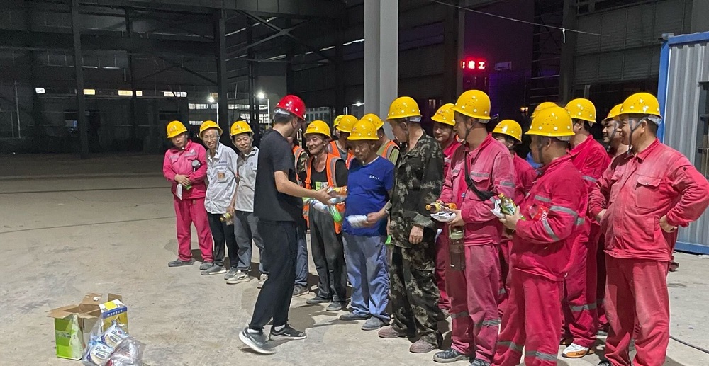夜晚加班,給施工人員送去食物飲品補充能量