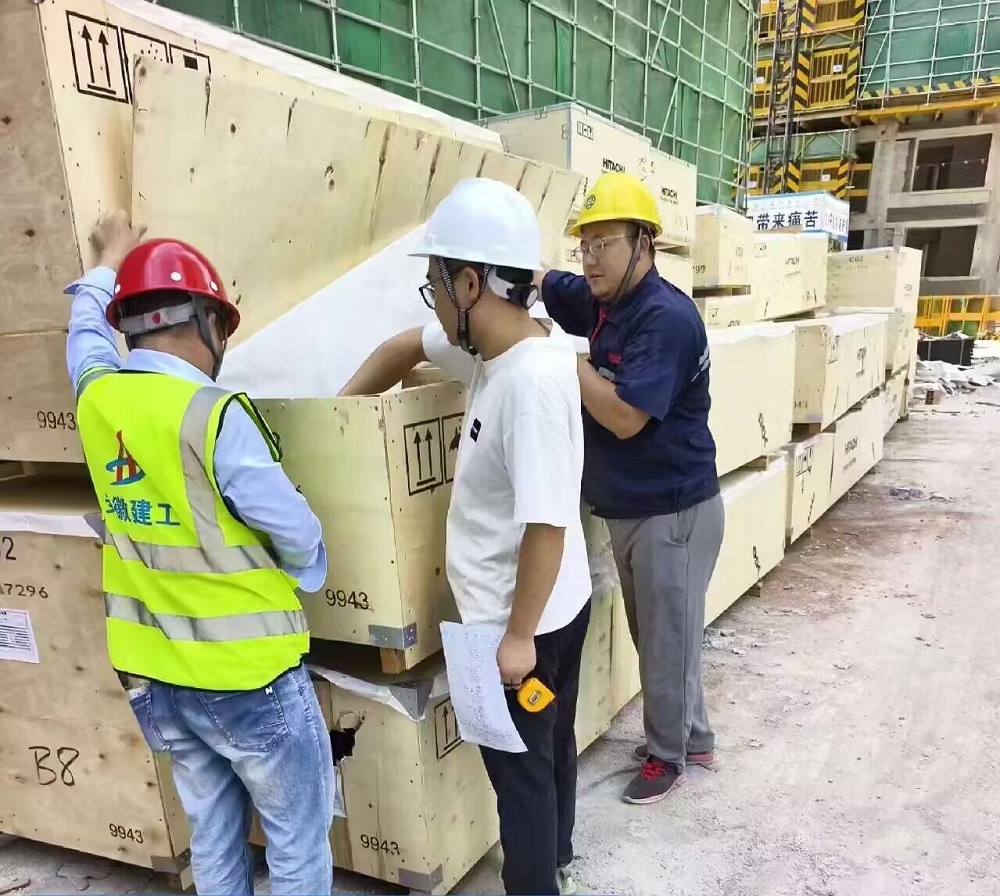 現場(chǎng)人員正在進(jìn)行到貨電梯檢查
