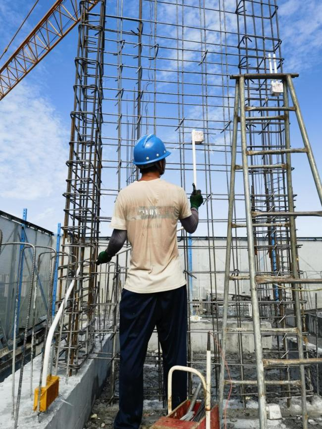 已經(jīng)被汗水浸濕衣服的小伙是水電工王雙軍,他正在密密麻麻的墻柱鋼筋中布置線(xiàn)管。