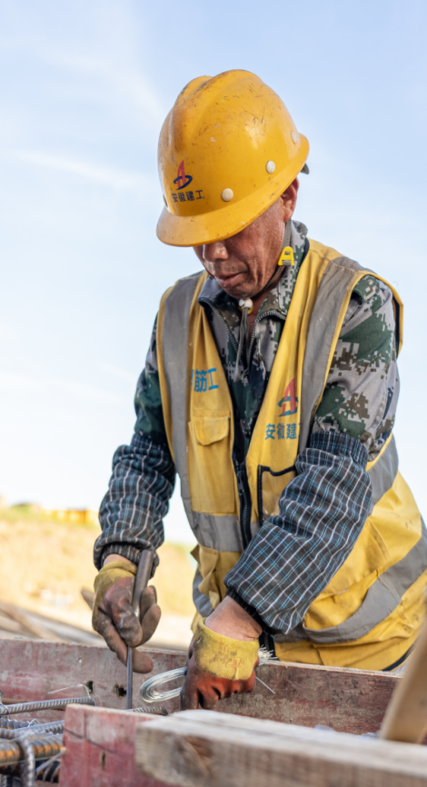 暴曬下的鋼筋表面十分燙手,站在邊上都能感覺(jué)到熱度。來(lái)自六安的程振合和李中俊作為鋼筋工能手正頭頂烈日,在鋼筋叢林中“穿針引線(xiàn)”。李中俊一手固定住鋼筋,一手熟練地用工具把鋼筋綁扎好。這樣的動(dòng)作,他每天都要重復無(wú)數次。