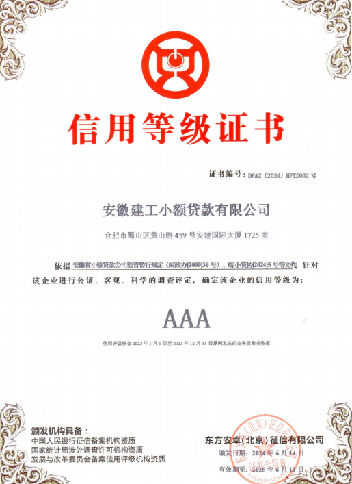 2024年7月,在省地方金融監督管理局指導的小貸行業(yè)評級中,安徽建工小額貸款有限公司(下稱(chēng):建工小貸)再次榮獲“AAA”行業(yè)最高信用等級。這也是建工小貸連續第八年獲此榮譽(yù)。這一榮譽(yù)不僅是對建工小貸一年來(lái)經(jīng)營(yíng)管理、風(fēng)險防控、業(yè)務(wù)規模、經(jīng)營(yíng)業(yè)績(jì)等的監管綜合評價(jià),更是對其在省內行業(yè)中產(chǎn)業(yè)鏈示范單位肯定。