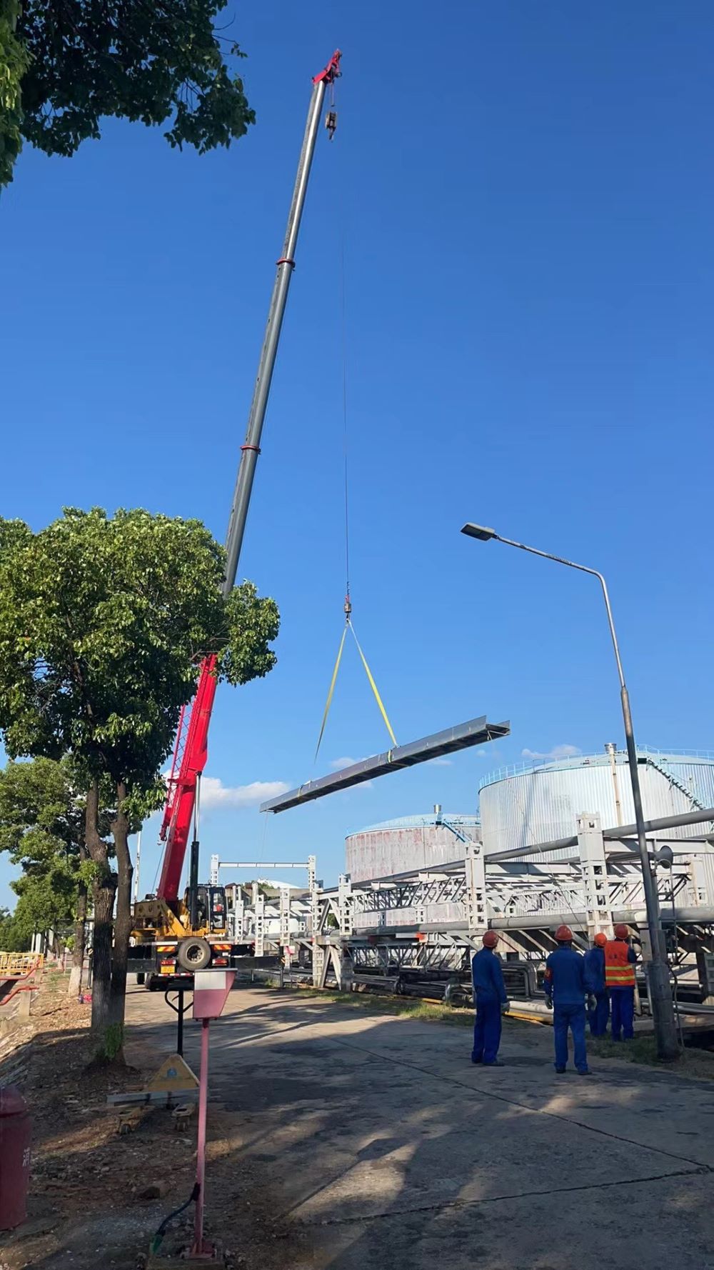 8月1日,該項目進(jìn)行電纜槽盒托架吊裝工作,該電纜槽盒托架采用18米每段進(jìn)行吊裝,先集中預制后到現場(chǎng)管廊處進(jìn)行對接后在吊裝至管廊上。該托架重量約0.6噸,使用1臺25噸吊車(chē),將整段托架吊至上方,并對接安裝連接成一個(gè)整體。在項目部全體人員的共同努力下托架順利吊裝到位,該托架吊裝完成標志著(zhù)此項目安裝工作進(jìn)入尾聲,為項目按時(shí)完工奠定了良好的基礎,目前正在進(jìn)行電纜橋架吊裝和電纜鋪設工作。