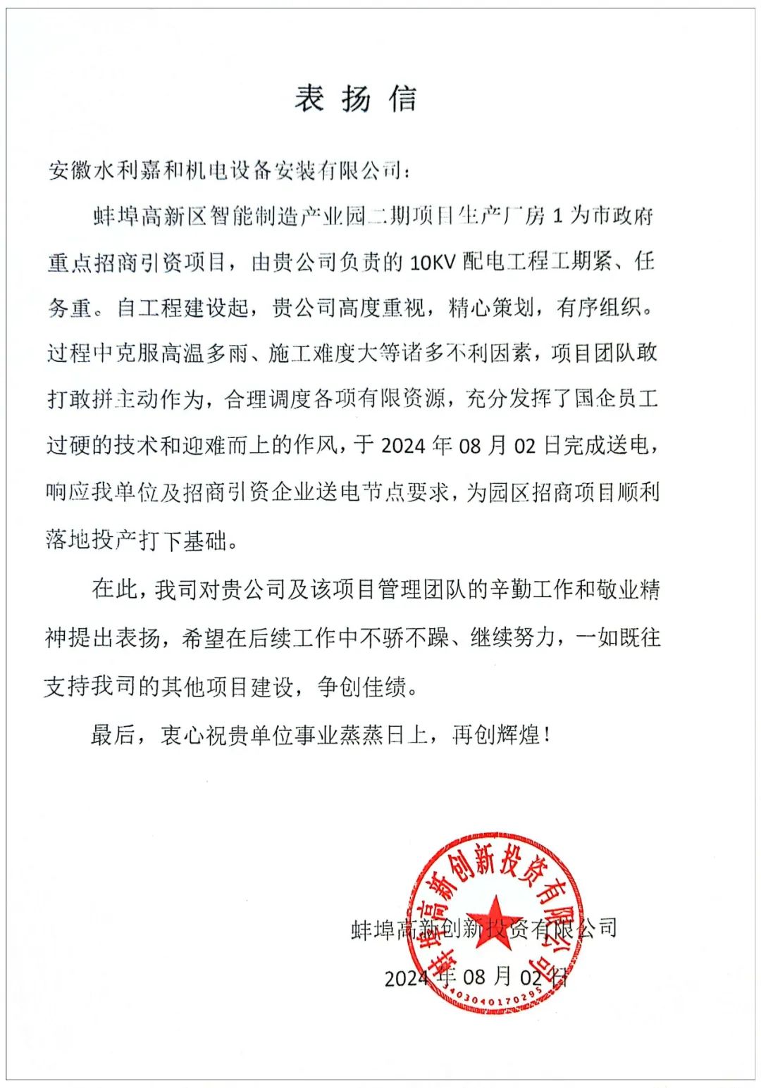 8月2日,隨著(zhù)拉閘送電指令的下達,安徽水利嘉和機電承接的蚌埠高新區智能制造產(chǎn)業(yè)園二期10KV配電工程正式通電。項目從開(kāi)工建設至完工僅用40天,獲得業(yè)主來(lái)信表?yè)P。
