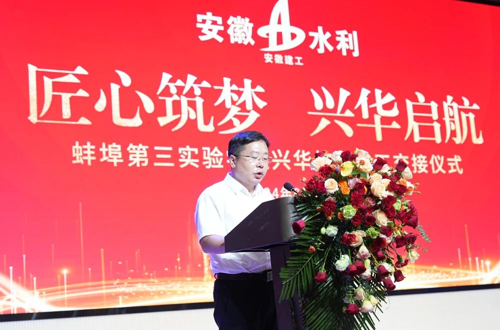8月20日上午,安徽水利承建的蚌埠自貿區山香學(xué)校項目交付儀式正式舉行。蚌埠市委教育工委委員、市教育局副局長(cháng)段元麗,蚌埠高新區黨工委副書(shū)記梅荊山,高投集團黨委書(shū)記、董事長(cháng)李徳旺,蚌埠第三實(shí)驗學(xué)校校長(cháng)王強、興華校區負責人馬蓉,安徽水利黨委委員、副總經(jīng)理周?chē)殖鱿桓秲x式。