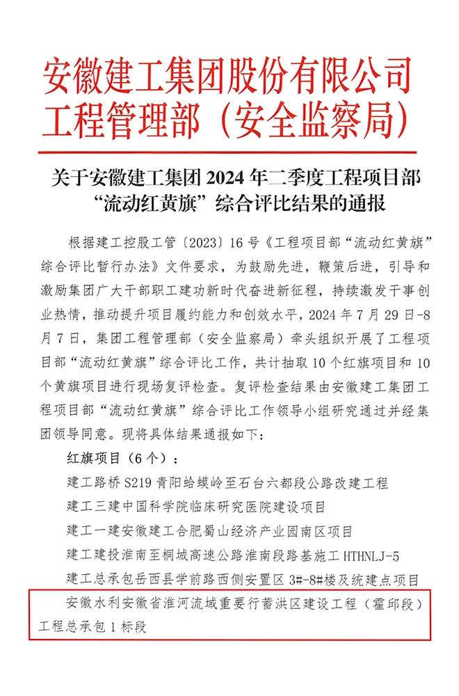 近日,由安徽水利承建的安徽省淮河流域重要行蓄洪區建設工程(霍邱段)項目在集團“流動(dòng)紅黃旗”綜合評比中成績(jì)優(yōu)異,獲評集團二季度“流動(dòng)紅旗項目部”稱(chēng)號。