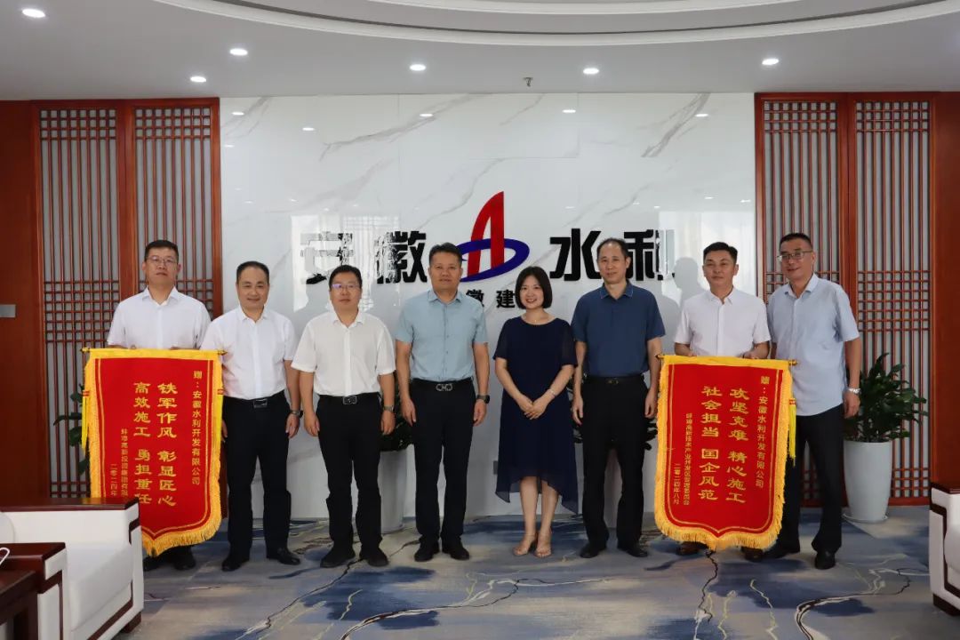 9月5日,蚌埠市高新區社會(huì )事業(yè)局黨委書(shū)記、局長(cháng)錢(qián)玉,蚌埠高新投資集團有限公司黨委書(shū)記、董事長(cháng)李德旺,副總經(jīng)理陳輝一行來(lái)到安徽水利,將兩面錦旗送到建工股份副總經(jīng)理、安徽水利黨委書(shū)記、董事長(cháng)張鍵手中,并就進(jìn)一步深化合作開(kāi)展會(huì )談交流。