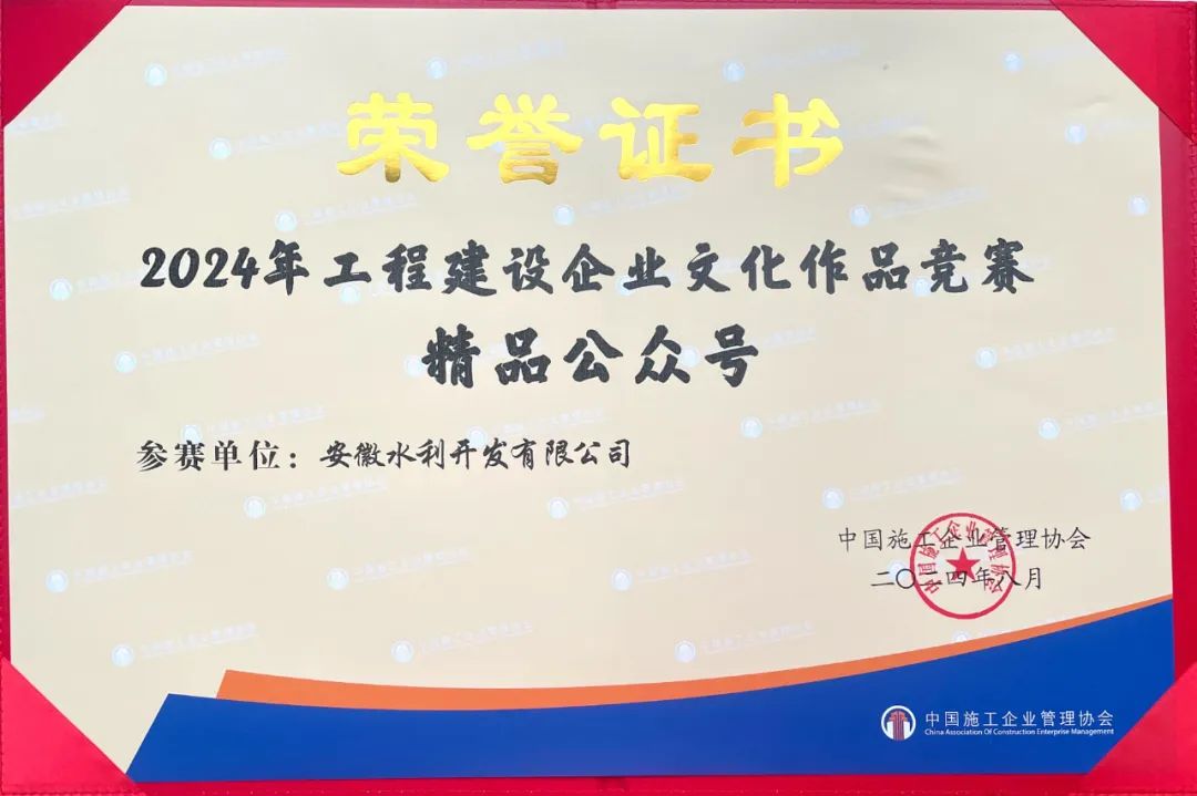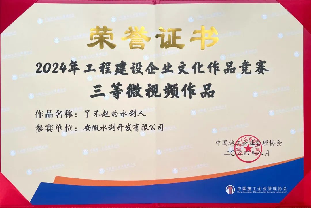 9月4日至6日,中國施工企業(yè)管理協(xié)會(huì )在南京召開(kāi)2024年工程建設企業(yè)文化建設成果交流會(huì ),安徽水利在公眾號、網(wǎng)站、企業(yè)文化案例、微視頻、書(shū)法多個(gè)類(lèi)別中,共入圍7項作品,2人獲評企業(yè)文化專(zhuān)家,1人獲評優(yōu)秀通訊員。