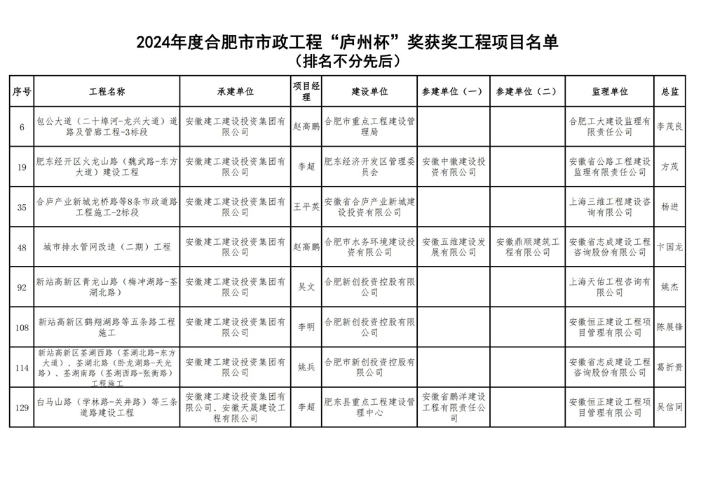 近日,合肥市市政工程協(xié)會(huì )公布了2024年度合肥市市政工程“廬州杯”獎獲獎項目名單,建工建投包公大道(二十埠河-龍興大道)道路及管廊工程-3標段等8項工程榜上有名,公司“廬州杯”獲獎數量再創(chuàng )新高。