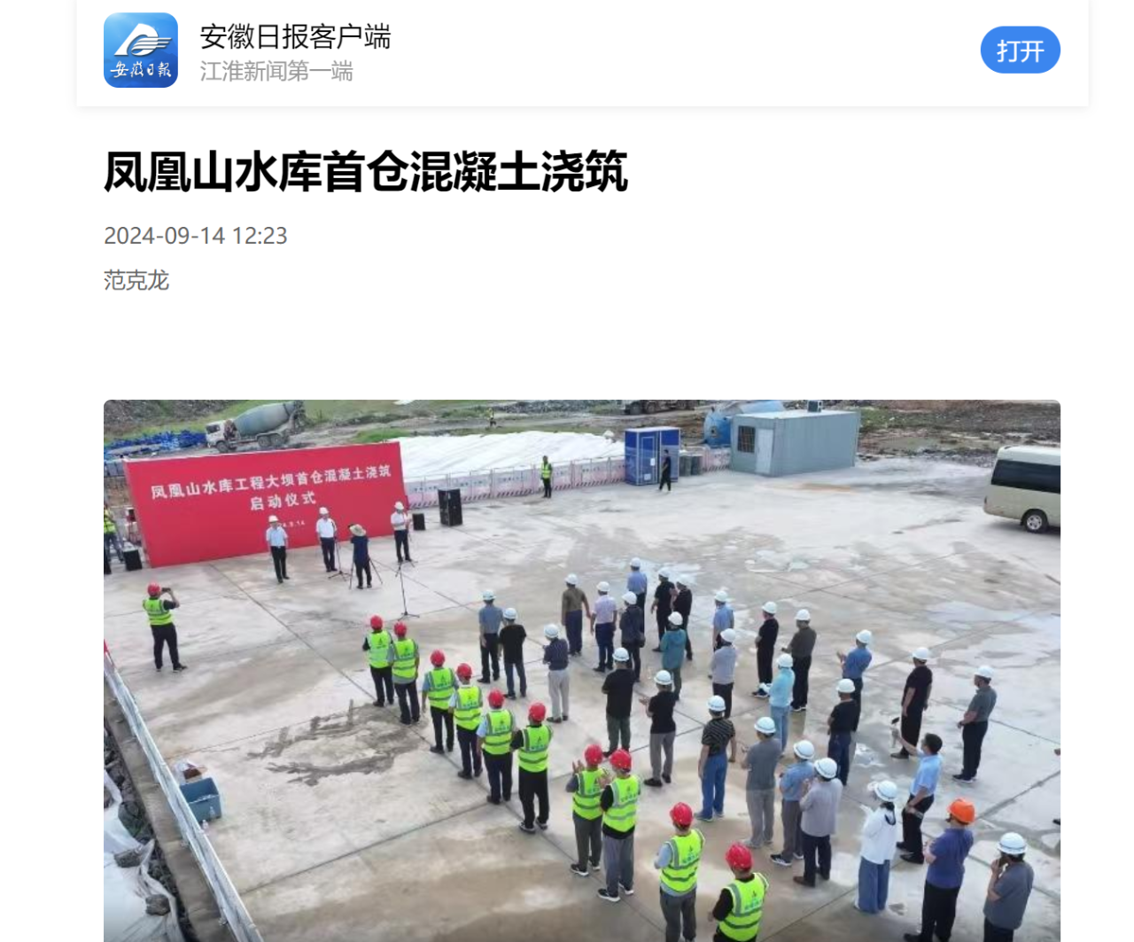 9月14日,安徽水利鳳凰山水庫大壩首倉混凝土正式啟動(dòng)澆筑,項目全面進(jìn)入主體結構施工階段。廣德市委書(shū)記周其紅出席儀式并宣布澆筑啟動(dòng)。 這一關(guān)鍵節點(diǎn),受到了安徽日報、中青報、中新社、新安晚報、宣城日報等主流媒體關(guān)注報道。