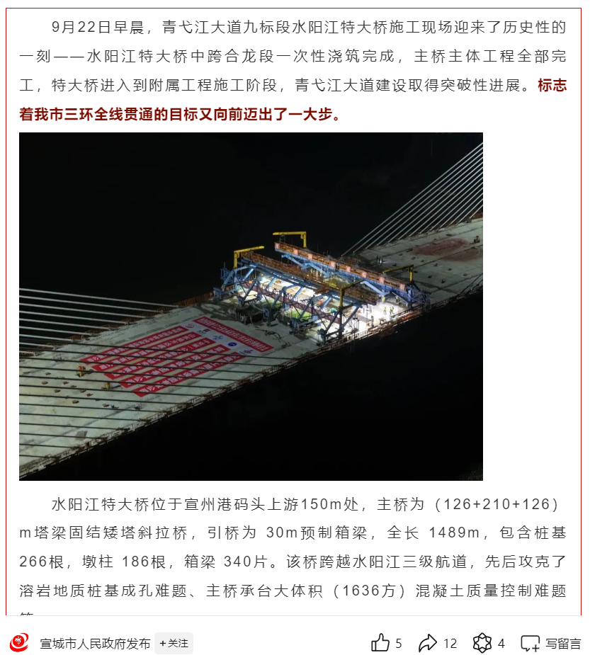 宣城市人民政府發(fā)布、宣城播報:水陽(yáng)江特大橋主橋順利合龍!