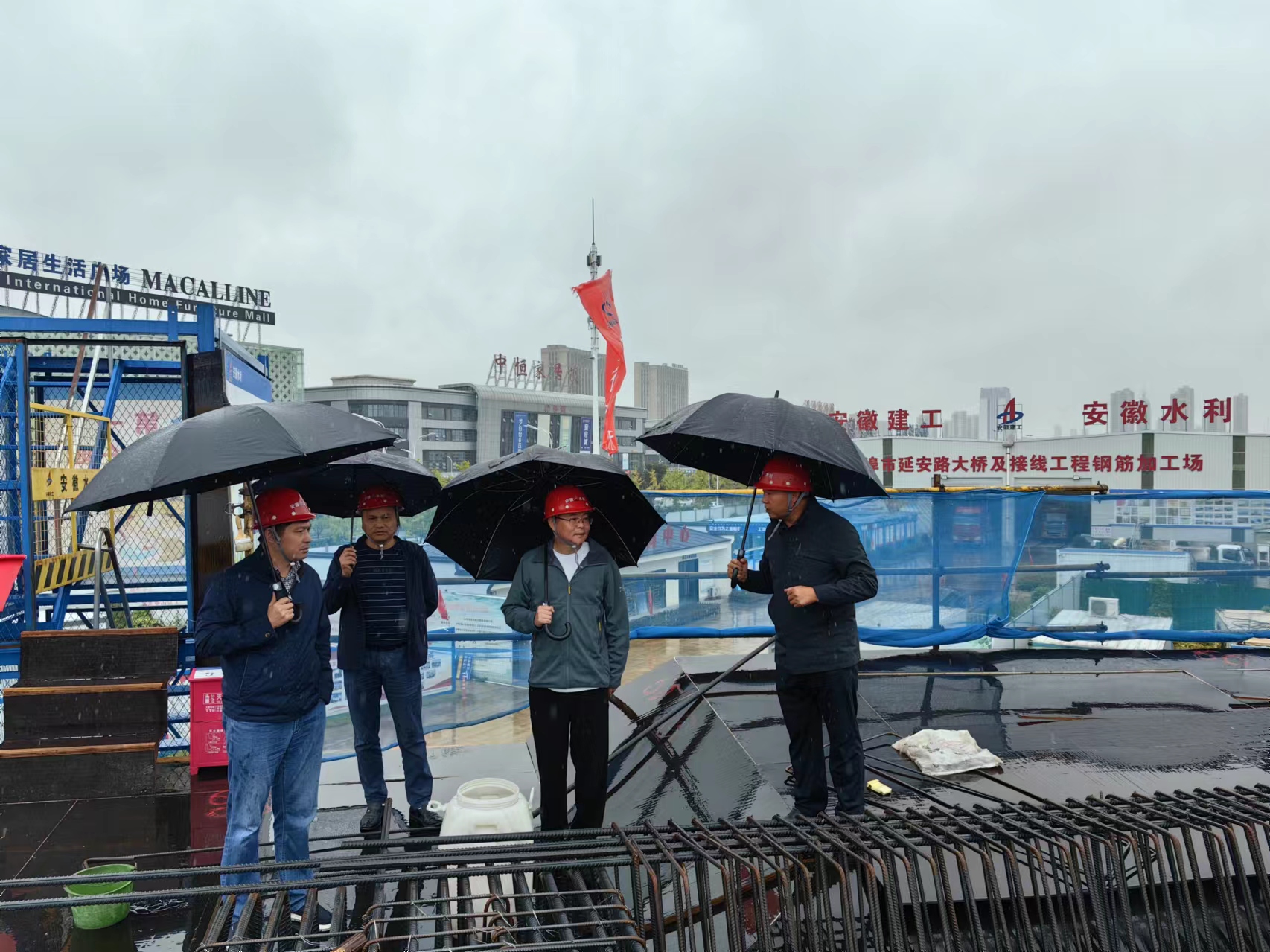 ▲10月6日,安徽水利黨委委員、副總經(jīng)理洪杰到路橋分公司蚌埠市延安路大橋及接線(xiàn)工程項目開(kāi)展國慶帶班檢查。洪杰強調,年前要加快延安路大橋及接線(xiàn)工程北岸橋臺、墩柱施工速度,爭取11月初完成施工,為現澆箱梁全面施工打下基礎,年后全力推進(jìn)南岸施工。