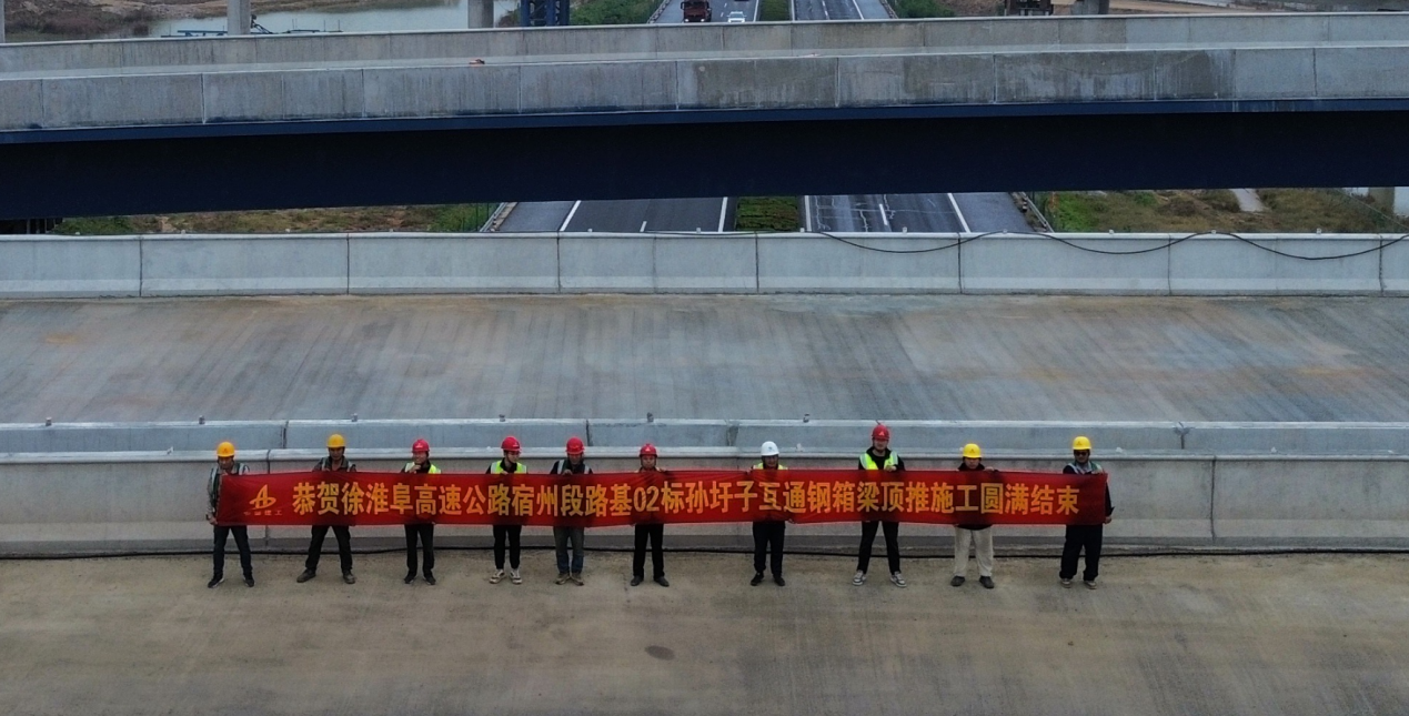 最新進(jìn)展!建工交航徐淮阜高速宿州段路基工程02標孫圩子互通區鋼箱梁頂推施工圓滿(mǎn)完成