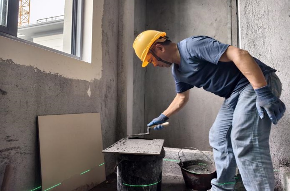鋪貼地磚的工人們嚴格按照施工標準,精準測量、細致切割、精心鋪設,讓樓梯間平整美觀(guān)。